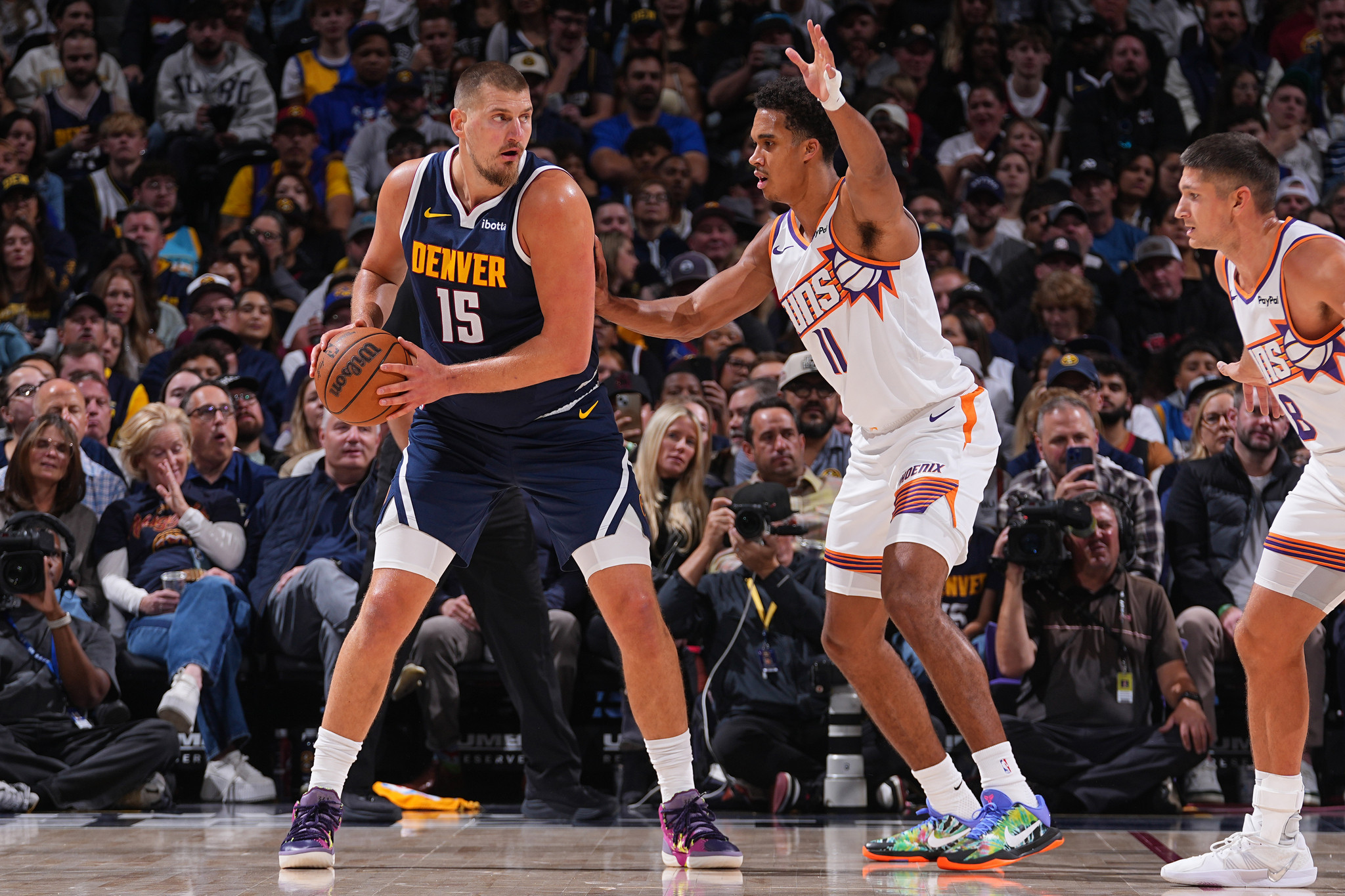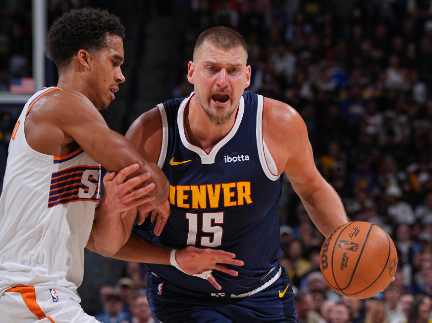 上半场,约基奇登场16分钟,1投1中拿到4分7篮板11助攻3抢断;下半场,第三节约基奇连续得分并且带队领先到20分,之后太阳反扑追到10分,掘金一波攻势再次拉开分差,三节打完掘金仍旧领先17分,约基奇三节拿到12分12篮板14助攻。