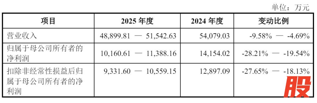 恒运昌预计2025年营收为4.89亿元到5.15亿元,较上年同期的5.4亿元下降4.69%到9.58%;预计净利为1.02亿到1.14亿,较上年同期的1.42亿元下降19.54%下降28.21%;扣非后净利分别为9331.6万元到1.06亿元,较上年同期的1.29亿元下降18.13%到27.65%。