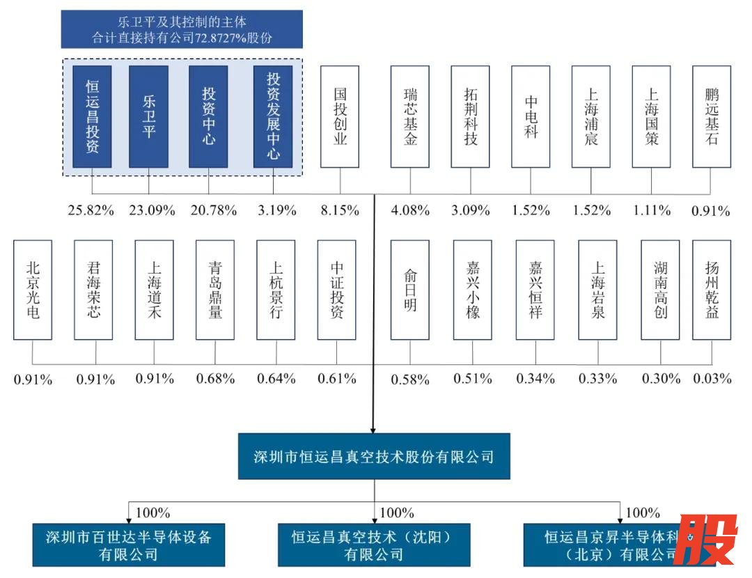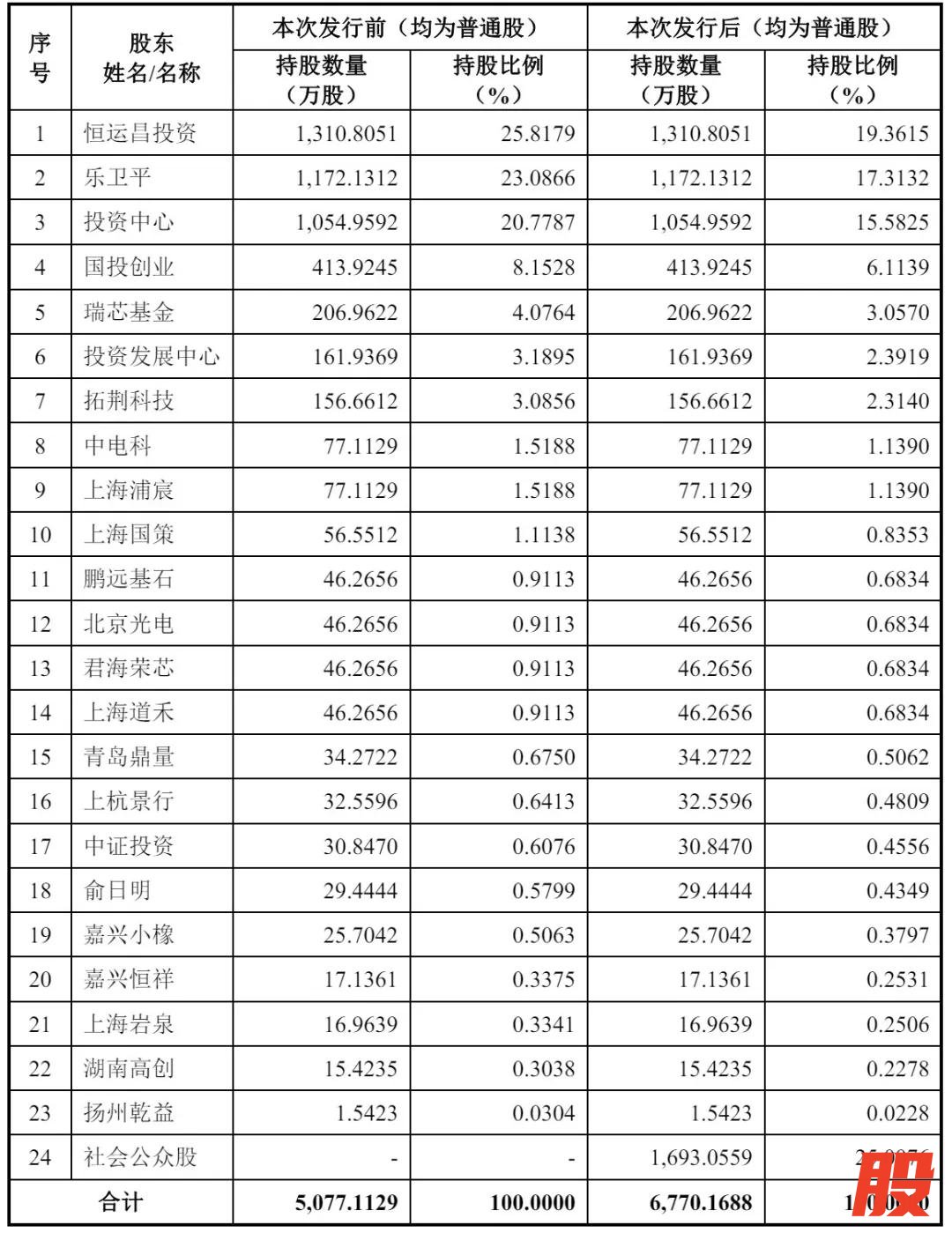 IPO后,恒运昌投资持股为19.3615%,乐卫平持股为17.3132%,投资中心持股为15.5825%,国投创业持股为6.1139%,瑞芯基金持股为3.057%,投资发展中心持股为2.3919%,拓荆科技持股为2.3140%,中电科、上海浦宸分别持股为1.139%,上海国策持股为0.8353%,鹏远基石、北京光电、君海荣芯、上海道禾分别持股为0.6834%;