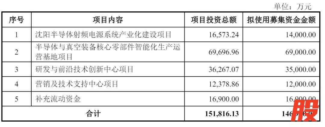 恒运昌计划募资14.7亿元,其中,1.4亿元用于沈阳半导体射频电源系统产业化建设项目,6.9亿元用于半导体与真空装备核心零部件智能化生产运营基地项目,3.5亿元用于研发与前沿技术创新中心项目,1.2亿元用于营销及技术支持中心项目,1.69亿元用于补充流动资金。