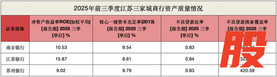 2025年前三季度,江苏银行、南京银行和苏州银行的不良贷款率分别为0.84%、0.83%和0.83%,其中江苏银行较上年末下降0.05个百分点,南京银行和苏州银行较上年末持平。